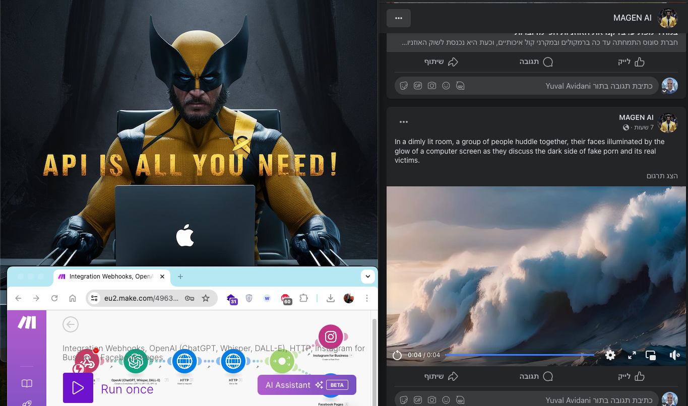 מצד ימין: צילום מסך מעמוד הפייסבוק החדש של האוטומציה שפתחתי שנקרא Magen AI (מוזמנים לעקוב אחריו) שכולו אוטומציה ו-AI.