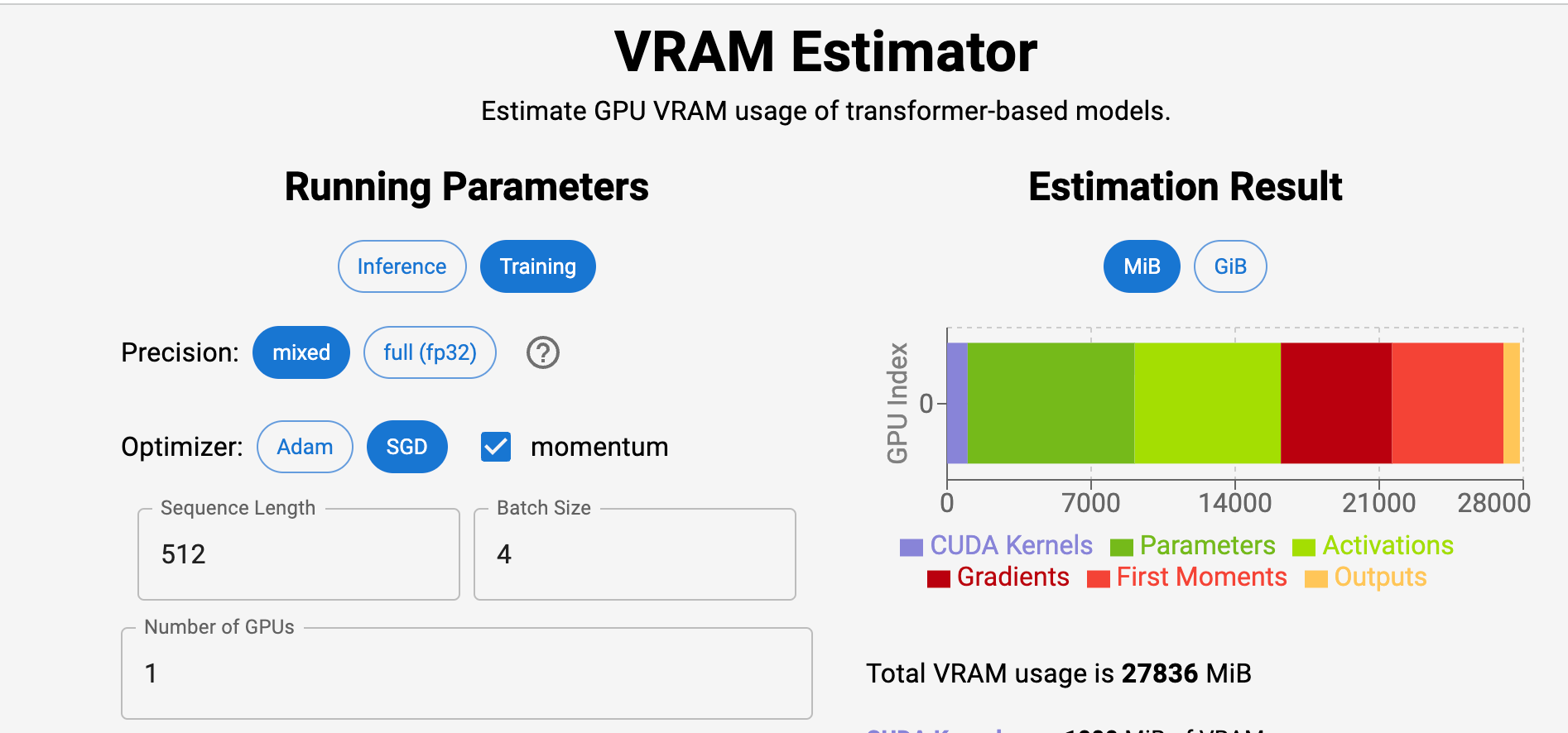 ויש גם אתר ממש מדליק שאפשר להזין בו את הערכים של הרשת והוא לבד מחשב כמה vRAM אנחנו נצטרך כדי להריץ את המודל, ממש צריך לבחור את סוג הייצוג של המודל ואת הערכים השונים ומקבלים את כל המידע: