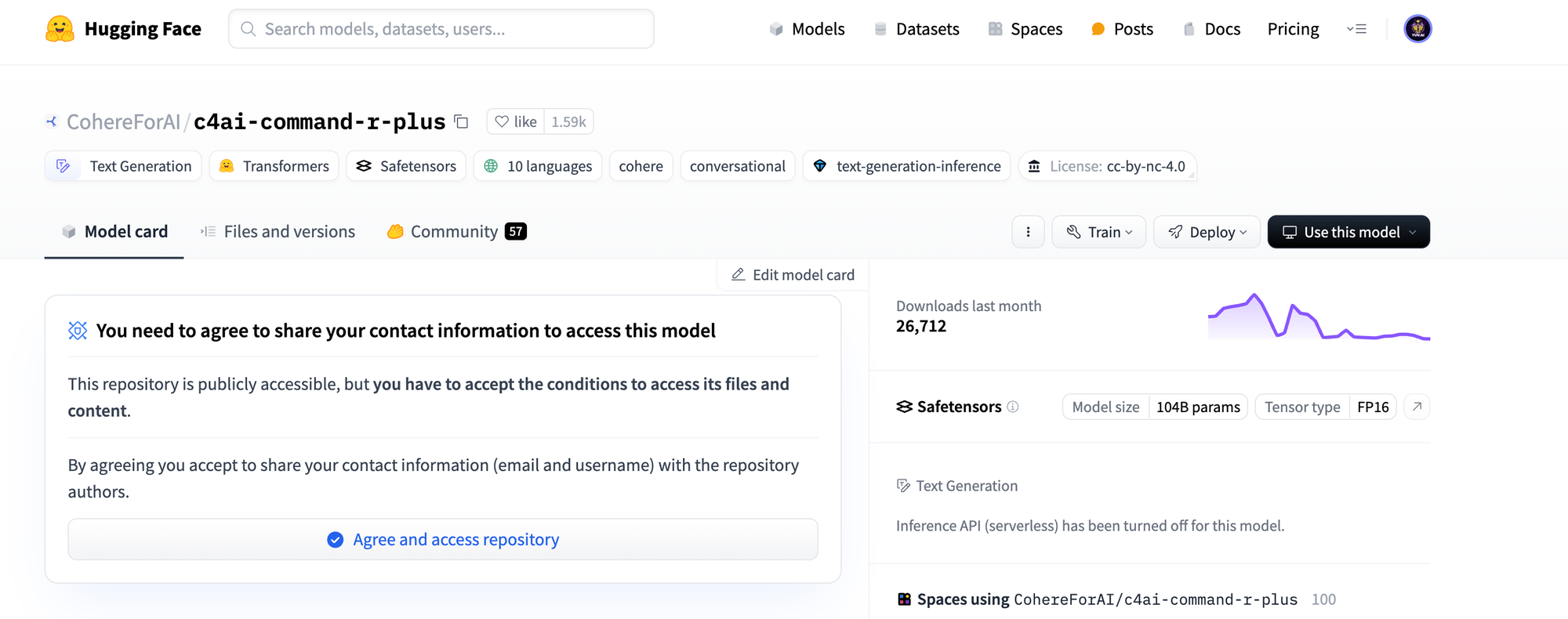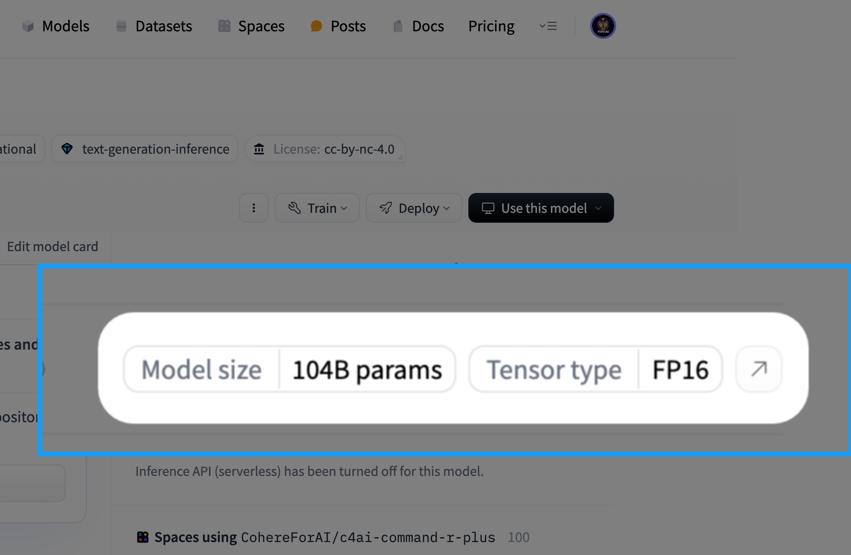 באתר HuggingFace יש המון מודלים של שפה שפתוחים לשימוש בחינם. בכל מודל ניתן למצוא את מספר הפרמטרים שהוא מכיל וכך גם לחשב לבד האם אנו יכולים להריץ אותו או לא. למשל בעמוד של מודל השפה Command-R-Plus של Cohere המדהימים ניתן לראות: